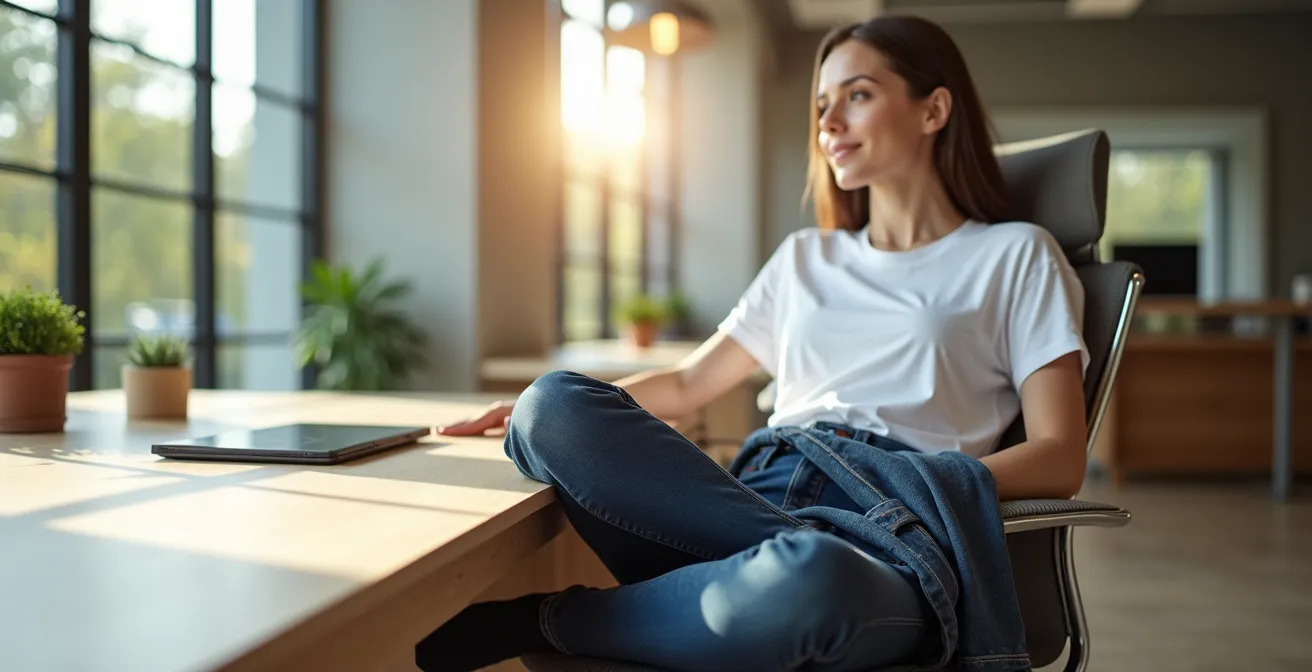 Oubliez le t-shirt à message et le jean troué. Votre crédibilité se construira sur des matières nobles et des coupes impeccables. Remplacez le t-shirt en coton par un polo en maille fine ou un pull en cachemire. Troquez le jean délavé contre un pantalon en flanelle de laine ou un chino de belle facture. Le blazer non structuré devient votre meilleur allié. L’idée est de conserver le confort et la souplesse du casual, tout en y injectant la qualité et le raffinement qui correspondent à votre séniorité. C’est une approche que l’on observe même au plus haut niveau dans des entreprises traditionnelles.
